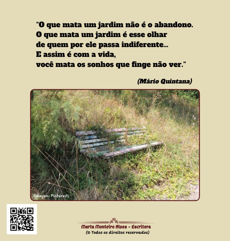 Por outro lado, a indiferença é como uma negligência ativa. É o ato de passar por algo que nos toca, sem oferecer nenhum tipo de cuidado ou atenção. Esse olhar indiferente, ao negar a existência e o valor do jardim, condena-o à morte lenta e dolorosa.